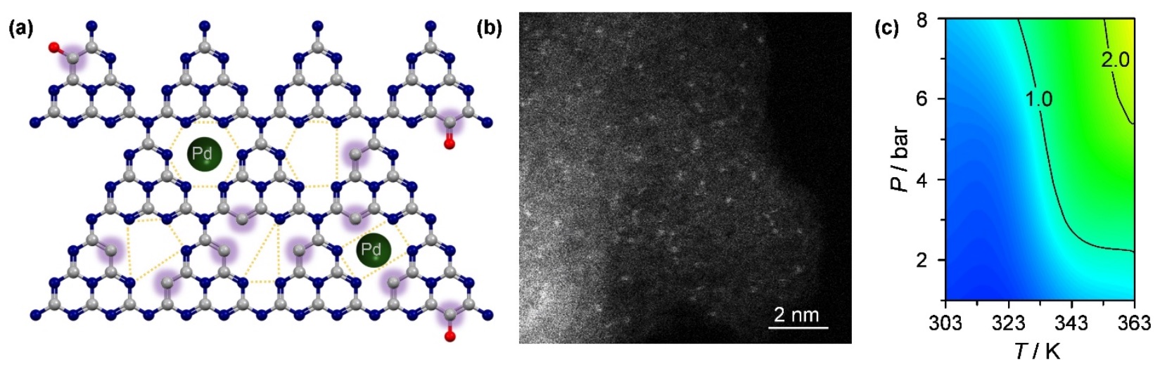 Figure 1 (a) Schematic of Pd atoms stabilized in the g-C3N4 structure. Doped C atoms are highlighted by a purple glow. Yellow dashed lines connect N atoms within the coordination sites. (b) AC-STEM image of the Pd dispersion on g-C3N4. (c) Reaction rate (in 103 molproduct molPd-1 h‑1) of 2-methyl-3-butyn-2-ol hydrogenation at different temperatures and pressures.