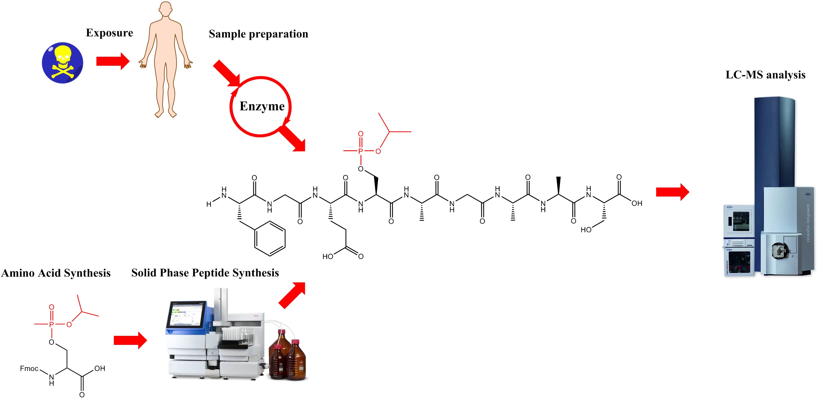 The synthesized adducts can be used as reference standards in the search for evidence of exposure to nerve agents and are successfully in use in the development of biomedical analysis methods at Spiez Laboratory.