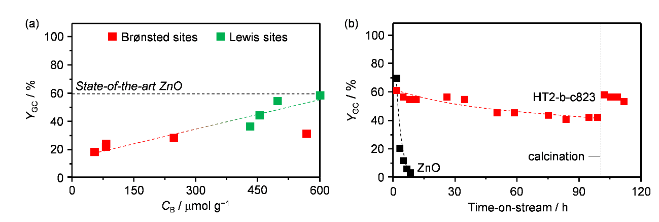 Glycerol carbonate, obtained by the carbonylation of waste glycerol with urea, is an important bioderived chemical with applications as a solvent and an intermediate. Its preparation would ecologically and economically benefit from the availability of a heterogeneous catalyst, which contains cheap and abundant elements, has a scalable synthesis, is highly active and stable, retains its performance upon shaping into a technical form, and can be operated in continuous mode. In this work,1 we show that a mixed oxide of Mg and Al is a promising active phase for this reaction. The solid comprises widely available and non-toxic metals, is easily obtained through the thermal decomposition of a hydrotalcite-like material, and can almost match the product yield of state-of-the-art Zn-based catalysts2 (Figure 1a), while displaying an outstanding resistance against leaching, which causes the rapid dissolution of the latter. In-depth characterization uncovered that Lewis-basic centers are crucial to activate glycerol through dehydrogenation. Their concentration was maximized by optimizing the composition and calcination temperature of the precursor, thus reaching up to 60% glycerol carbonate yield (Figure 1a). Millimeter-sized extrudates showing comparable basic properties to the powder sample, a well-developed meso- and macroporosity, and high mechanical stability were obtained using a natural clay, bentonite, as a binder and thermally activating the hydrotalcite only after shaping. Upon testing in a continuous reactor under tuned conditions of temperature and pressure and in the presence of an aprotic solvent, the system showed the same glycerol yield as in the batch tests. During 100 h on stream, its activity decreased by 20% due to fouling (Figure 1b), but could be fully restored upon burning-off of the carbonaceous deposits. This work discloses the development of a green material that exhibits high efficacy in a sustainable transformation, highlighting key parameters for consideration in the design of an industrially-relevant chemocatalytic technology.