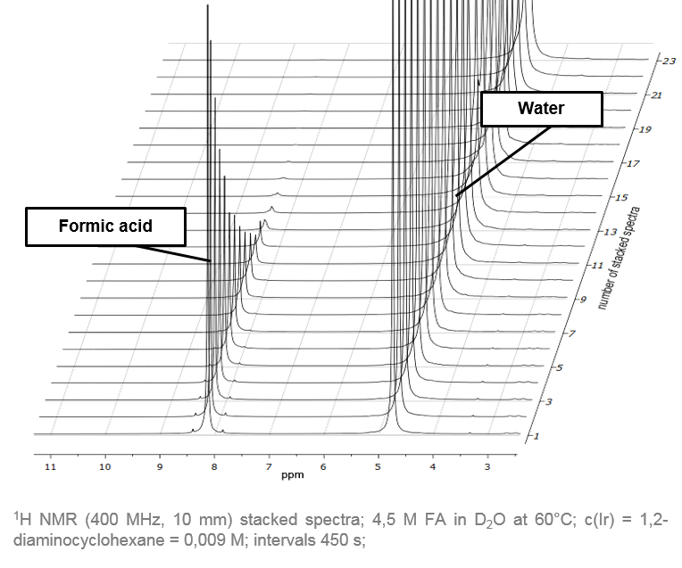 An excellent group of catalysts are iridium complexes with the general formula [Cp*Ir(N,N’)Cl]X, where Cp* is a cyclopentadienyl moiety, X a counter ion and N,N’ are part of a bidentate nitrogen donor ligand. Our researched aimed to identify a more powerful catalyst from this group by systematically introducing N,N’ ligands with different steric and electronic properties. We determined characteristic numbers such as turn over frequency, kinetic and mechanistic information and activation energy to describe our catalytic systems accurately.[8]