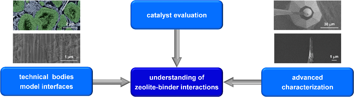 When applied in industry, zeolite catalysts are often shaped with the aid of binders and other additives into practical millimetre-sized forms.1 The interaction of the component phases during the shaping and subsequent application can alter the type, amount, distribution, and accessibility of active sites, which can beneficially or detrimentally impact the catalyst performance compared to the pure zeolite powders typically studied in early development stages.2 Although several mechanisms, such as the neutralization of acid sites via the migration of exchangeable cations, the insertion, substitution, or removal of framework metals, and the physical obstruction of micropores have been cited, the exact nature and extent of these effects are not well understood. By developing strategies to isolate the interface between common binders and zeolite crystals, we aim to correlate the morphological, compositional, and structural changes that occur under the conditions experienced by the catalyst in practice. For this purpose, approaches to representatively sample zeolite extrudates or to construct model interfaces, controlled (hydro)thermal treatments, catalytic evaluation in the conversion of methanol to olefins, and state-of-the-art characterization are coupled with the visualization through advanced microscopic and spectroscopic techniques (Figure 1). In particular, energy dispersive X-ray spectroscopy, electron energy-loss spectroscopy, and atom probe tomography are applied to map chemical interactions between the zeolite and binder phases, while the crystalline structure at the interface is tracked by electron diffraction. The attained insights have clear implications for advancing the understanding and development of novel porous solids in diverse industrial applications.