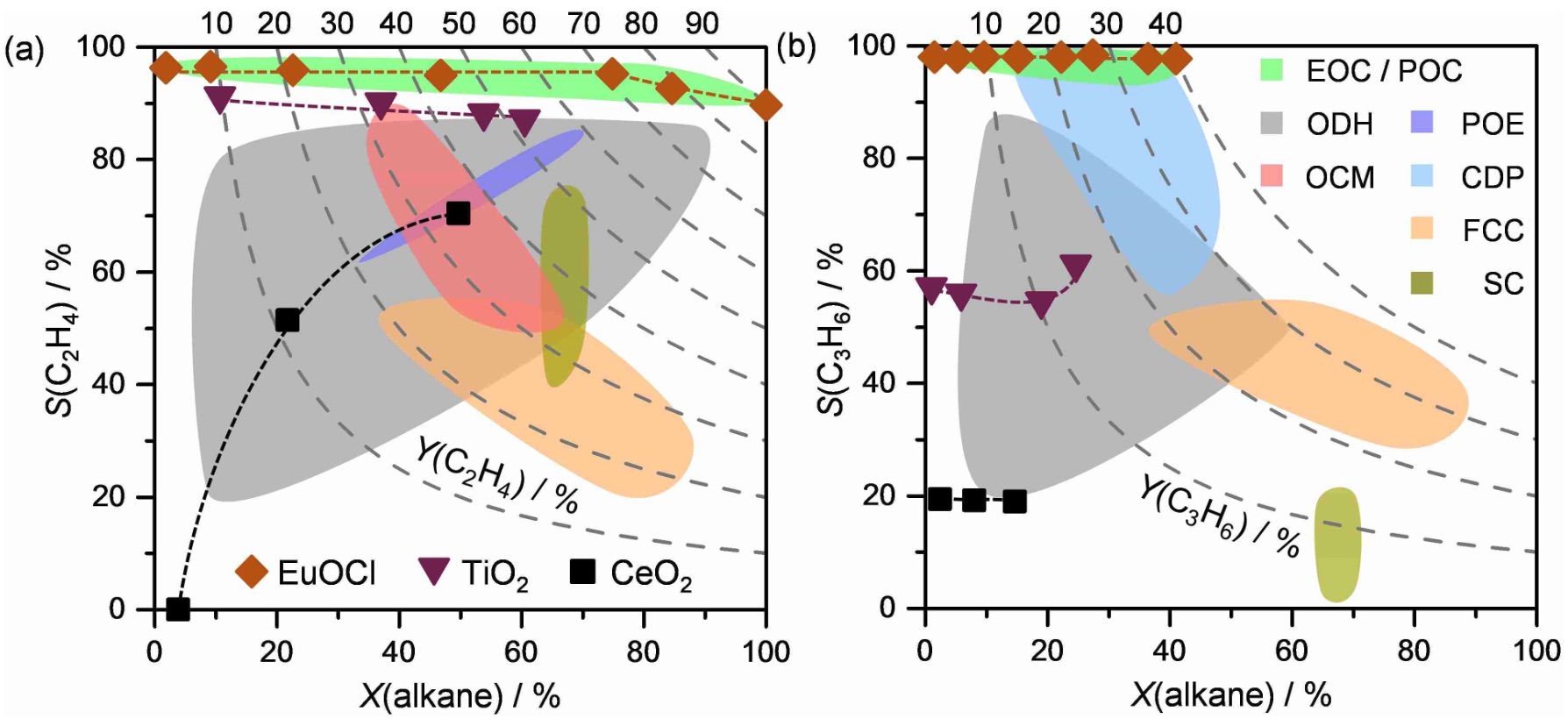 Figure 1 Alkene selectivity versus alkane conversion in the oxychlorination of (a) ethane (EOC) and (b) propane (POC) over EuOCl, TiO2, and CeO2. Dashed gray lines indicate the olefin yield, colored areas denote the single-pass molar alkane conversion and olefin selectivity achievable in EOC, POC, the oxidative dehydrogenation of ethane and propane (ODH), partial oxidation of ethane (POE), oxidative coupling of methane (OCM), catalytic dehydrogenation of propane (CDP), fluid catalytic cracking (FCC), and steam cracking (SC) of ethane and naphtha.