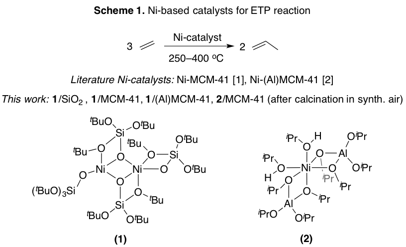 Here, using a combination of surface organometallic chemistry and thermolytic precursor approach [4], we synthesized well-defined Ni(II) surface sites on silica-based supports (MCM-41 and Al-MCM-41) exploiting nickel siloxide (1) and aluminate (2, Scheme 1) molecular precursors. Their structure and reactivity towards ethylene will be discussed.