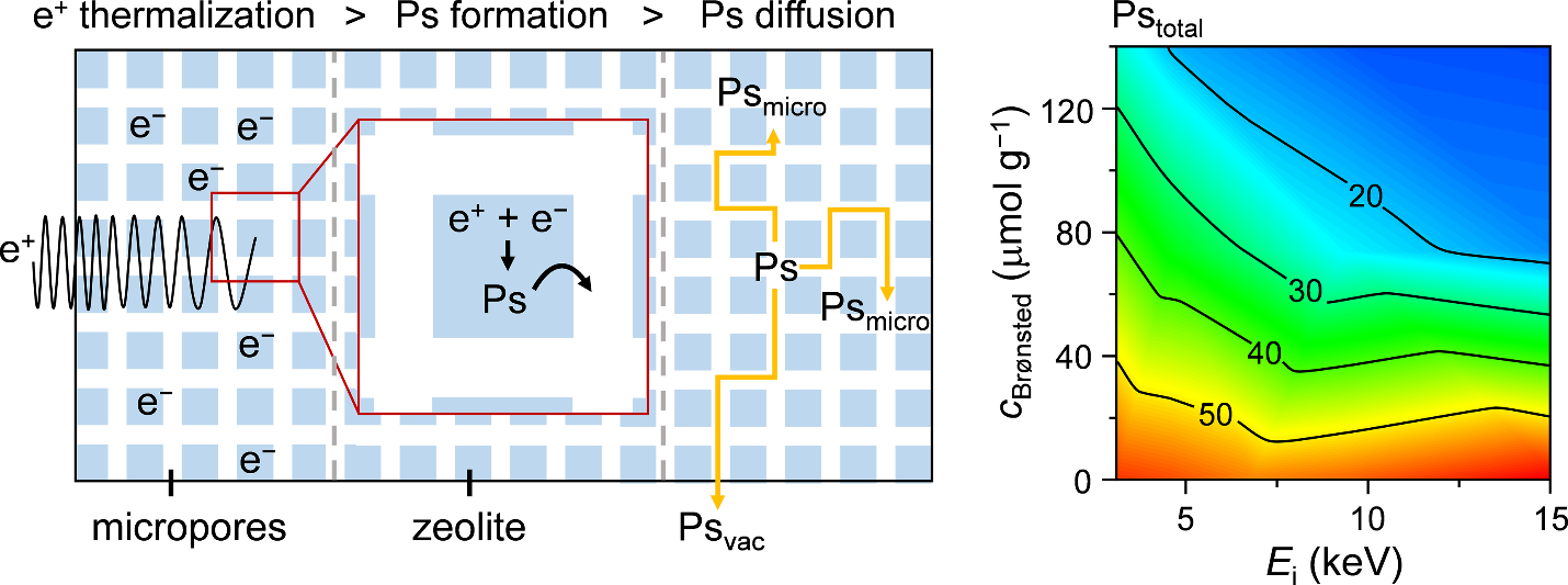 Positron annihilation lifetime spectroscopy (PALS) demonstrates unique sensitivity towards elucidating the connectivity of pore networks in zeolitic materials, which is based on the diffusional behavior of metastable ortho-positronium (o-Ps) species formed in situ upon positron implantation.1 Chemical interactions between o-Ps and acid sites in a solid have been widely postulated to perturb the purely kinetic response.2 However, the specific impact of the nature and amount of acid sites on the lifetime and intensity of different o-Ps components, and the implications for porosity analysis, have not been quantified. By studying a series of ZSM-5 (MFI structure) samples with tailored crystal size and Si:Al ratio, we map the dependence of the amount (Pstotal) and fractional distribution (Psmicro, Psvac) of o-Ps measured on the concentration of Brønsted acid sites and the implantation depth of positions (Figure 1). By modeling the possible mechanisms of interaction, we show that the presence of Brønsted acid centers most significantly affects the thermalization and delocalization of o-Ps, while the impact on diffusion and correspondingly on Psmicro and Psvac is negligible. The study of commercial ZSM‑5 samples confirms the generality of the findings and permits elucidation of the crystal size-dependent nature of kinetic and acidity effects. The impact of Brønsted acid sites can be eliminated by neutralization through exchange with Na+/K+ ions. The negligible role of Lewis acid sites is confirmed from the study of a large-crystal Sn-MFI zeolite. By utilizing a controlled synthesis approach we are able to better account for the chemical interaction of o-Ps with acid centers, providing critical insights for the determination of pore quality in zeolites by PALS.