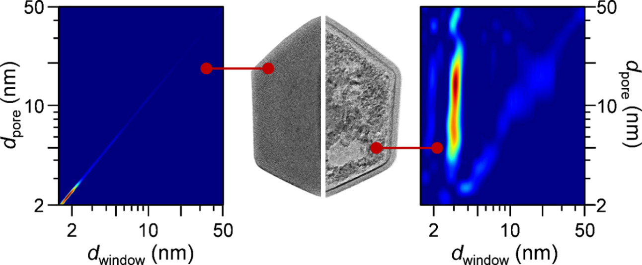 The porosity of layered hydroxides can be greatly enhanced by thermal activation.1 Despite intense interest in the associated structural transformations, porosity changes have been almost exclusively described in terms of primitive bulk descriptors (surface area, pore volume, average pore size), providing limited insight into the pore architecture (i.e., the geometry, location, and connectivity of the pores). Here, we map the variations in porosity upon thermal activation of well-crystallized Mg(OH)2 and isostructural layered double hydroxide (LDH, [M2+1-xM3+x (OH)2]x+(An-x/n)·mH2O) materials through novel characterization approaches as transmission electron microscopy (TEM) coupled with in situ heating, positron annihilation lifetime spectroscopy (PALS), and differential hysteresis scanning (DHS) by high-resolution argon sorption (Figure 1).2,3 Despite exhibiting comparable surface area enhancements, arising from the formation of micro- and mesoporosity, striking differences in the structure of the developed pore networks for both materials are observed. As visualized by TEM, the substitution of trivalent metals like aluminium into the brucite-like sheets restricts the growth and improves the thermal stability of the pores, which form abundantly throughout the sample. Quantitative analysis by DHS reveals that the geometry of mesopores in the most highly porous samples is significantly constricted. Complementary insights are obtained by PALS, which evidences the asynchronous development of micro- and mesopores and readily distinguishes differences in the transport properties. The complexity of the pore evolution demonstrated by this approach illustrates the scope for improving mechanistic understanding in the design of porous materials derived from layered hydroxides.