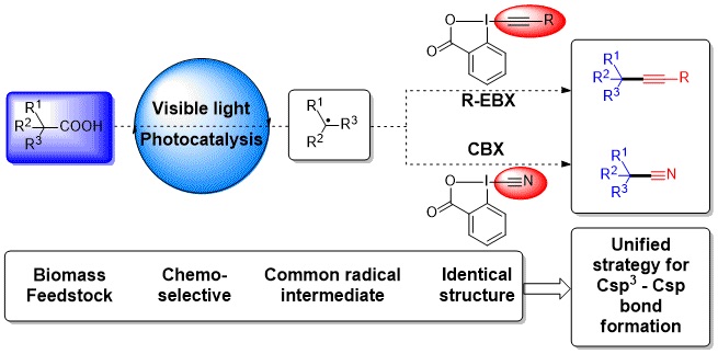 Aliphatic alkynes and nitriles are functional groups of great significance, naturally occurring and broadly used as versatile building blocks in organic synthesis. They find applications from material to medicinal and pharmaceutical sciences. A unified strategy to access both classes of compounds under eco-friendly conditions is, therefore, highly desirable. Herein, we describe the straightforward decarboxylative alkynylation[1] and cyanation[2] of broadly available carboxylic acids using photoredox catalysis and cyclic hypervalent iodine reagents. In both reactions, the simplest benziodoxolone reagent was the most successful. Functional groups tolerance is high and reactions can be scaled up to generate useful intermediates in drug synthesis. According to computational and experimental studies, two different mechanisms can be proposed, based on the oxidation potential of the reagents: via radical intermediates for alkynylation, and carbocation intermediates for cyanation.
