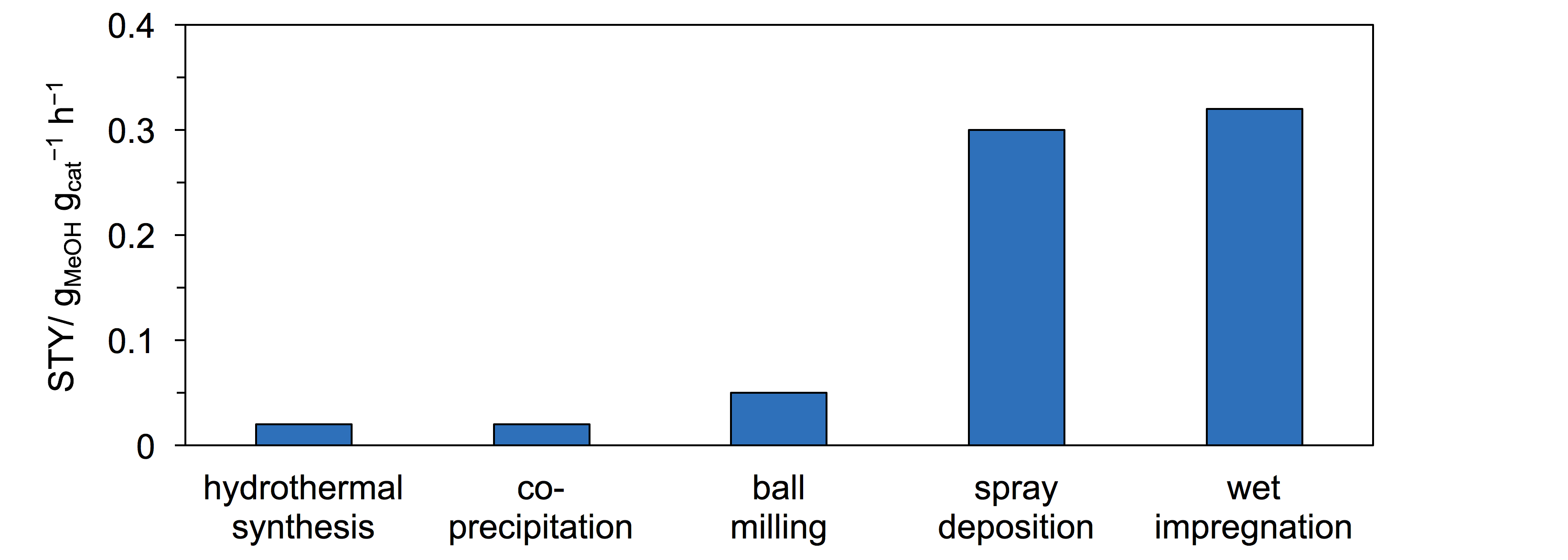 Figure 1 Space time yield (STY) of methanol in the direct hydrogenation of CO2 over In2O3-ZrO2 catalysts prepared by different synthesis methods.