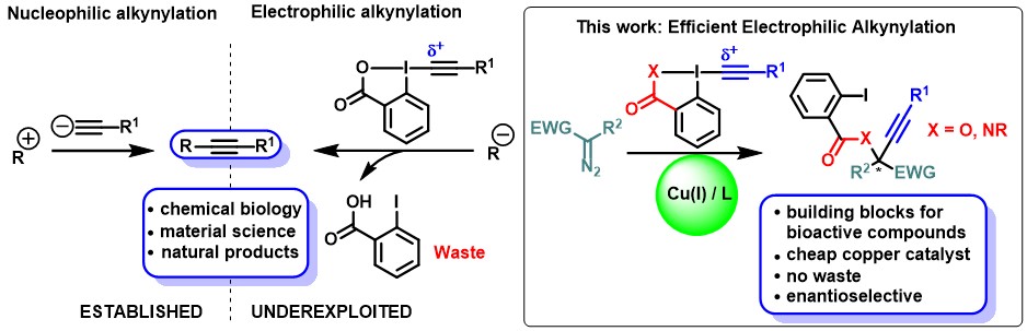 Alkynes are widely represented in biologically active natural products, materials, and medicines. Their use in cycloaddition reactions with azides (“Click Chemistry”) has found widespread applications in the synthesis of nanomaterials, chemical biology, and drug delivery.1a Consequently, the efficient synthesis of structurally diverse alkynes is a prominent objective in chemical research. One of the most often used methods for the synthesis of alkynes consists in the addition of acetylenes anions on electrophilic positions of molecules. In contrast, the reversed polarity approach, -the addition of alkynes onto nucleophiles- has been less investigated, limiting the structural diversity and potential applications of this important class of compounds. In this context, hypervalent iodine reagents, a fascinating class of reagents based on iodine, have been used extensively for electrophilic alkynylations due to their exceptional reactivity.1b,1c However, alkynylations using hypervalent reagents generates one equivalent of a side-product, leading to waste generation. In 2016, our group developed an unprecedented copper-catalyzed reaction for the introduction of alkynes onto organic molecules, in which all the parts of the reagents are incorporated into the product.2a Key for success was the use of cyclic hypervalent iodine reagents –EthynylBenziodoXolones (EBX), now also commercially available- and diazo compounds as reactive small organic molecules. This reaction is highly practical and proceeds under mild conditions for a broad range of substrates. It uses a cheap base metal catalyst (copper), whereas other methods in the field are based on the use of expensive precious transition metals, such as rhodium or palladium. Herein, we will describe further important extensions of our work of high significance for synthetic and medicinal chemistry: 1) The development of an asymmetric reaction giving access to enantioenriched products.2b This is an important breakthrough, as the enantiomers of organic compounds have different bioactivities. 2) The introduction of a new hypervalent iodine reagent (EBZ) allowing us to synthesize alkyne-containing amino acids,2c which are key building blocks for the synthesis of bioactive compounds.