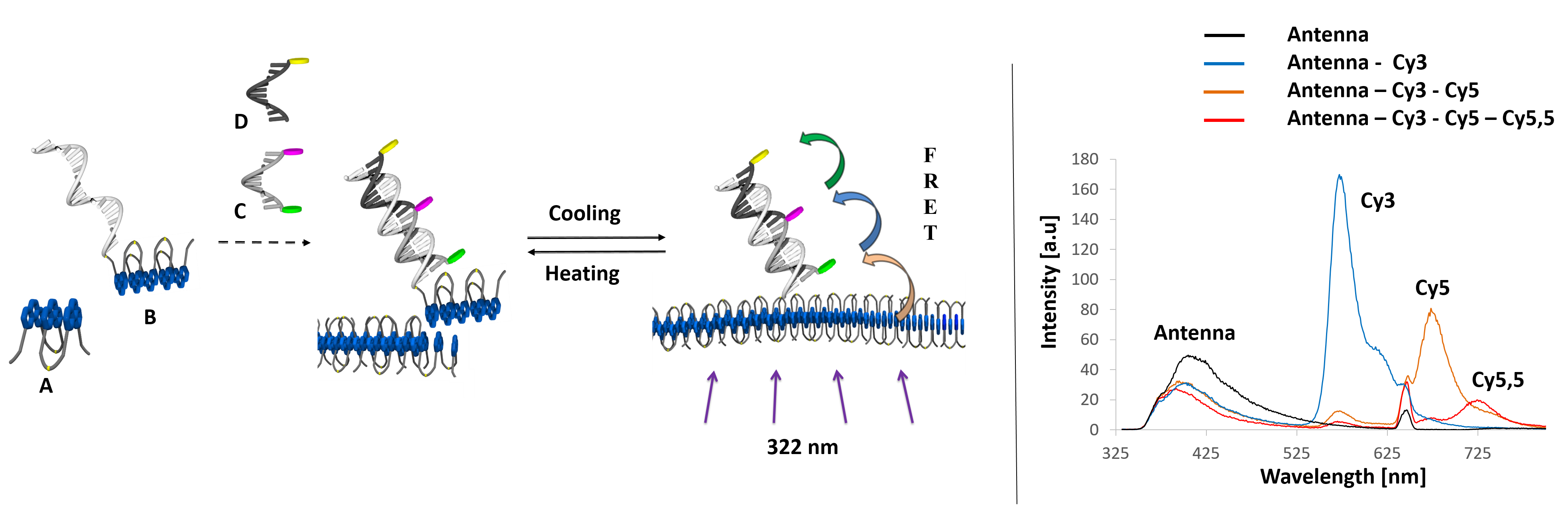 Assembly of phenanthrene oligomer A doped with 1.8 mol% of oligomer B composed of DNA strand (20 nucleotides) and 5`-end attached phenanthrene units yields in supramolecular light-harvesting platform upon heating-cooling process. SPs - photonic wire polymer is assemble via hybridization of DNA fragments labeled with a series of donor-acceptor cyanine dyes (C, D). Our spectroscopic studies clearly show that each addition of increasingly red-shifted dye significantly induces the consecutive quenching of the fluorescence of the previous donor-acceptor dye (Cy3, Cy5). Energy Transfer Efficiency is investigated by programing series of photonic wire configurations.