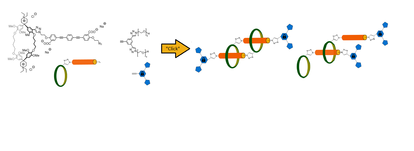 Construction of supramolecular nanosystems based on molecular daisy chains is an appealing option as their monomers are self-complementary and allow to access cyclic or linear oligomers by changing monomer concentration or solvent polarity1. Our cyclophane-based approach for the synthesis of daisy chains relies on association driven by a hydrophobic effect combined with electrostatically complementary subunits. The zwitterionic monomer was found to assemble to linear and cyclic daisy chains in aqueous media, which could be characterized by 1H-NMR after interlocking with bulky stoppers via a CuAAC-“click”-reaction. Introduction of redox-active chromophores into the monomer is expected to give daisy chains with switchable dimensions, which could be integrated into molecular muscles. Synthetic investigations towards this goal are currently in progress.
