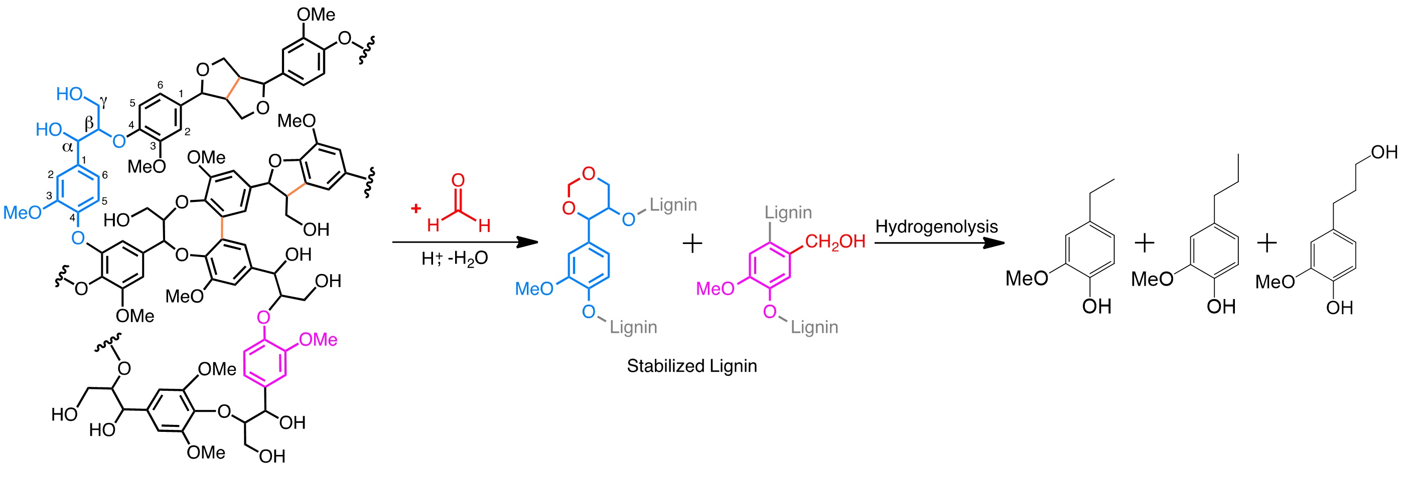 Based on a recent discovery, the utilization of formaldehyde during biomass pretreatment avoids lignin condensation and provides stabilized organoslv lignin monomers. Figure above represents the stabilization of lignin monomers by formaldehyde and the products after hydrogenolysis.[2] This research studies the possibility of performing hydrogenolysis under mild condition (120 ᵒC) by considering the effect of temperature, reaction media and heterogeneous catalyst on the hydrogenolysis of biomass derived lignin.