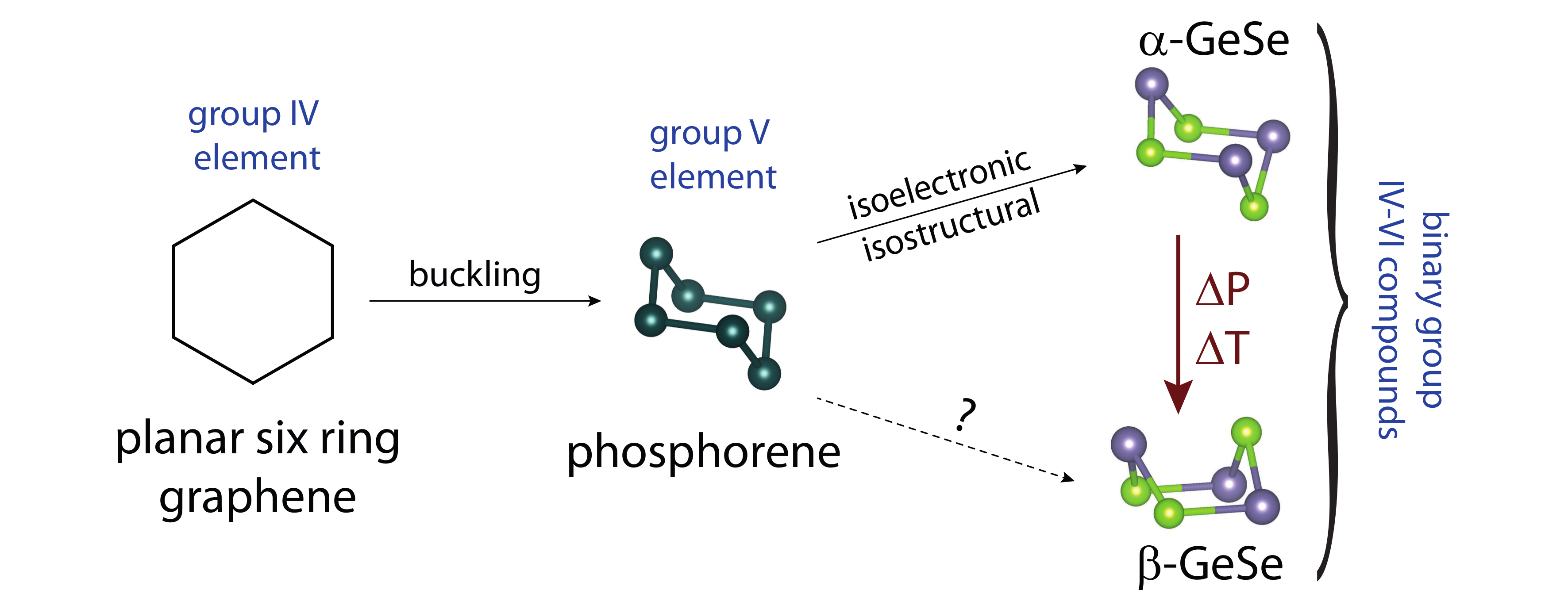 In this presentation, we report the electronic and structural properties of β-GeSe [7], a previously unreported polymorph of GeSe, with a unique crystal structure that displays strong two-dimensional structural features. β-GeSe is made at high pressure and temperature and is stable under ambient conditions. Here, we will compare it to its structural and electronic relatives α-GeSe and black phosphorus. The new β form of GeSe displays a boat configuration for its Ge-Se six-membered ring, while the previously known α form, and black phosphorus, display the more common chair configuration for their six-rings. Electronic structure calculations suggest that β-GeSe has a bulk band gap of Δ ≈ 0.5 eV, and, in its monolayer form, Δ ≈ 0.9 eV. These values fall between between those of α-GeSe and black phosphorus, making it a promising candidate for future applications.