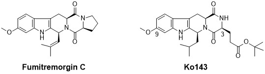 Fumitremorgin C (FTC) is a natural product produced by the fungus Aspergillus fumigatus that was first isolated in 1977 by Clardy. The compound is a potent and partly selective inhibitor of the ABCG2 transporter, but it also exhibits profound neurotoxicity. Ko143 is a synthetic analog of FTC, which is not neurotoxic, but retains the ABCG2-inhibitory capacity of the naturalproduct.[1] Over the course of this project, several analogues of Ko143 with modifications at positions 3 and 9 of the tricyclic scaffold as well as a ring expanded analogue were synthesized. Moreover, a new and more efficient synthesis of Ko143 and fumitremorgin C was developed. This involves an improved route to the 6-methoxytryprophan building block, a stereoselective reduction of an imine-intermediate and a more efficient approach to amide bond formation.