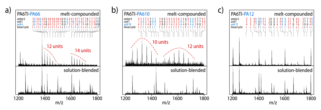 Figure 1. MALDI-TOF spectra of semiaromatic PA6TI melt compounded with 50 wt% of aliphatic (a) PA66, (b) PA610 or (c) PA12, together with the corresponding reference spectra of the polymers solution-blended at room temperature. Peaks are assigned to the pure PA6TI (black), the pure aliphatic segments (blue), and copolymer segments consisting of a mixture of the two components (red). The observed distribution of mass peaks is hence consistent with extensive transamidation and randomization of the polymer sequence in the copolymers PA6TI-PA610 and PA6TI-PA66 resulting from melt compounding.