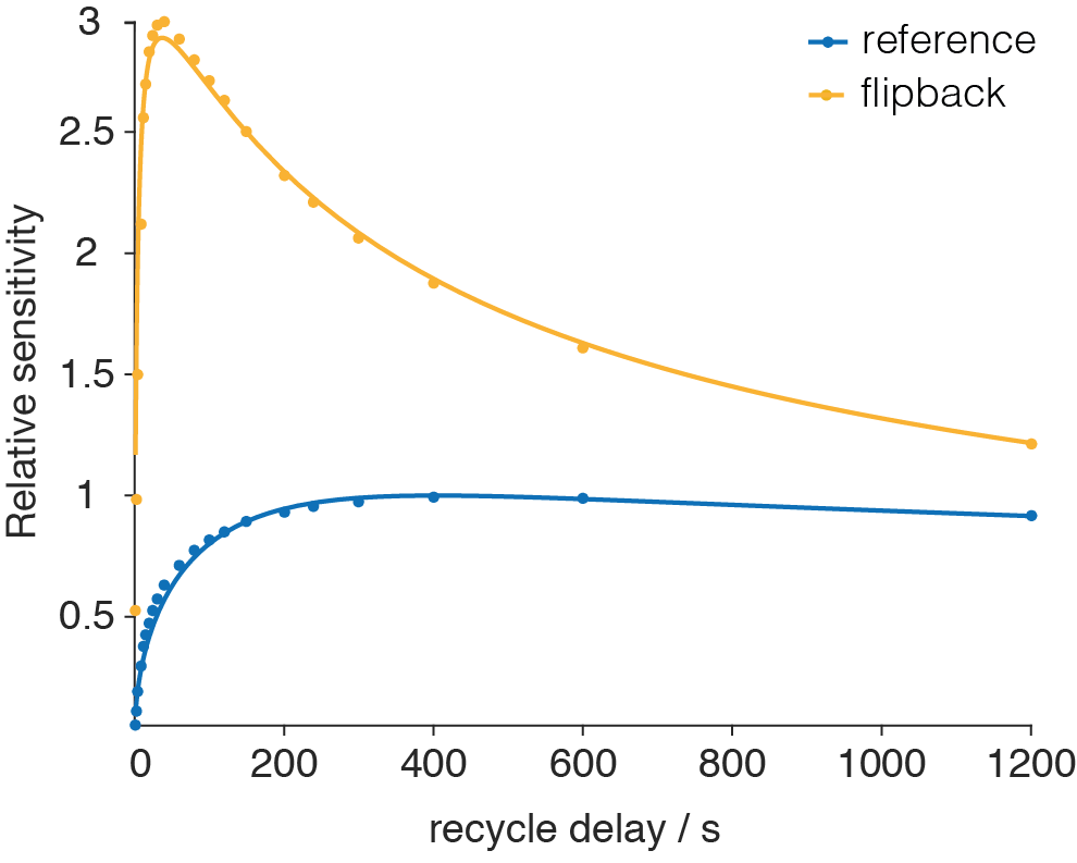 Figure 1. Experimentally observed sensitivity improvements of salicylic acid. The flip-back cross-polarization experiment (yellow) is compared to the same experiment without the flip-back pulse (blue) and the curves are fit to the data using a biexponential recovery model for longitudinal I-spin magnetization. The sensitivity is normalized to maximum sensitivity without a flip-back pulse.