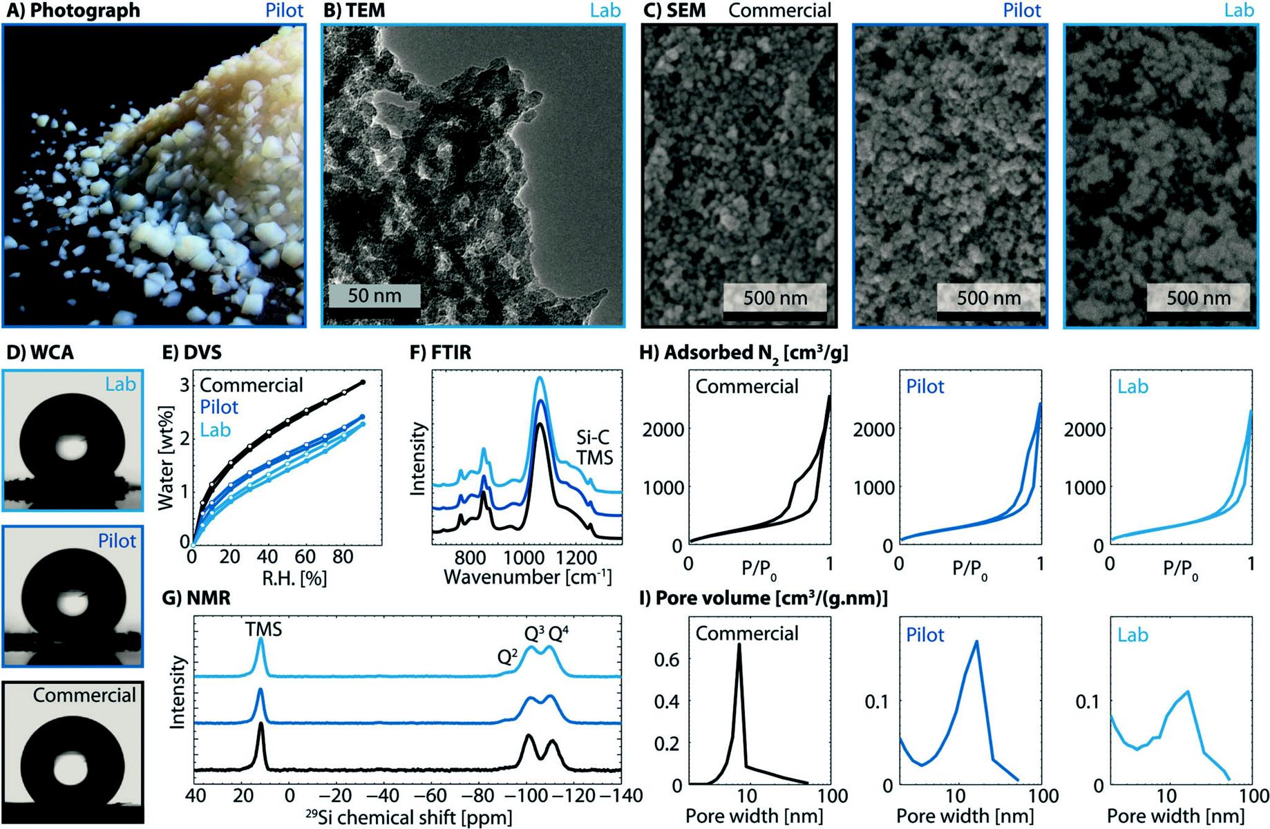 Figure 1. Structure, properties, and surface chemistry of one-pot and commercial aerogel. A) Photograph, B) TEM image, C) SEM images, D) water contact angle (WCA), E) dynamic vapor sorption (DVS), F) FTIR spectra, G) 1H–29Si CP MAS NMR spectra, H) nitrogen sorption isotherms, I) pore size distributions.