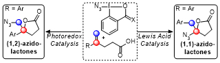 Amino lactones[1] and amino alcohols[2] represent important classes of compounds, which have crucial applications in natural products synthesis and in medicinal chemistry. In recent years, neutral cyclic hypervalent iodine reagents benziodoXoles have emerged as privileged tools in group-transfer chemistry. In addition, being stable crystalline compounds, they are easy to handle and user friendly.[3] In particular, AzidoBenziodoXolones (ABX) and AzidoDimethylBenziodoXoles (ADBX) have demonstrated high efficiency in the transfer of azido group onto organic molecules using metal catalysis. [3] Herein, we describe a versatile synthesis of azidolactones through the cyclization of carboxylic acids onto alkenes, based on photoredox and palladium catalysis. (1,1) and (1,2) azido lactones can be selectively synthesized. Modulating the properties of the catalyst and the benziodoxol(on)e reagent serving as azide source led to either a radical or Lewis Acid mediated process and favored formation of only one of the possible regioisomers starting from the same starting material. These transformations have been carried out under mild conditions using a low catalyst loading and gave access to a large scope of azido lactones.[4]