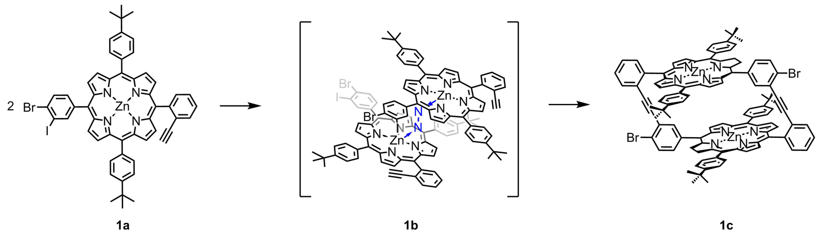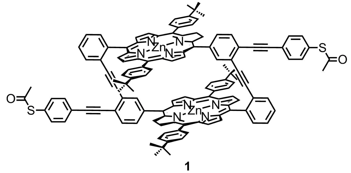 The switch is structurally based on a phenyl ethynylene cyclophane containing two porphyrin cores in face to face orientation. A thioacetate on each side of the macrocyclic structure allows gold electrode contacting in a MCBJ. The synthetic progress is summarized and shown on the poster. A dipyrromethane and two benzaldehyde derivatives are condensated to an assymetric porphyrin 1a. It is proposed, that after complexation, a hydrazine templated pre-organised complex 1b can be formed and closed to the macrocyclic structure 1c by twofold Sonogashira cross coupling conditions. Metalation, Sonogashira cross coupling reaction and trans-protection of the thiols is proposed to affort the target compound 1.