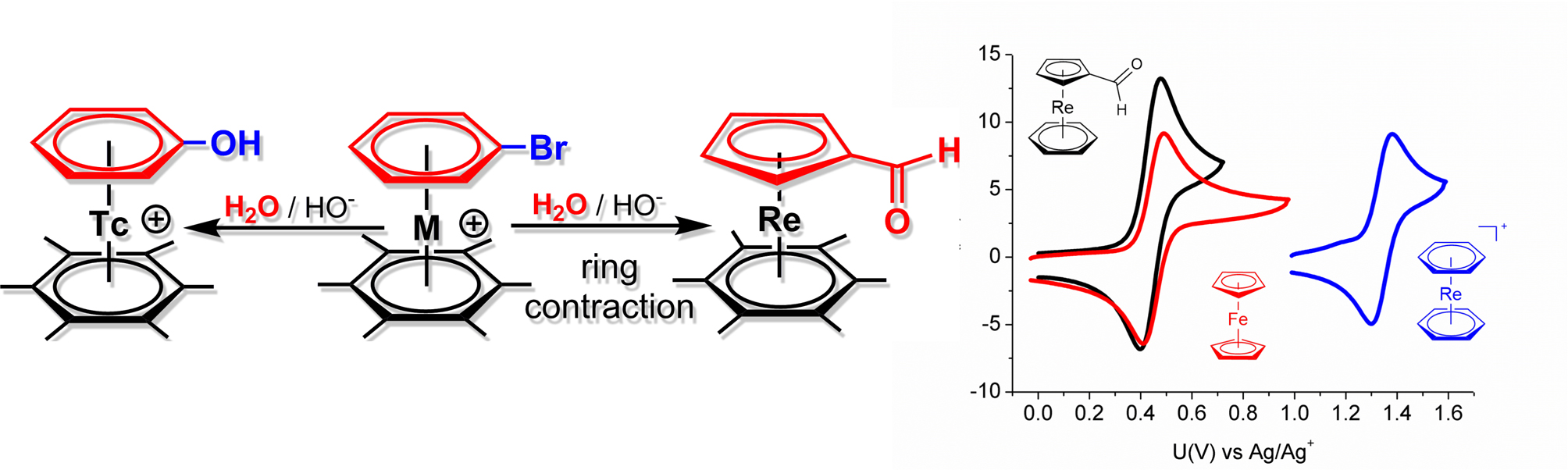 [M(arene)2]+-type complexes (M = Re, 99(m)Tc) of rhenium and technetium came recently into the focus of our attention since their homologous metal complexes are an established matched-pair for radio diagnosis and (radio)therapy. Hence, the synthesis of [Re(arene)2]+ type complexes was optimized and an efficient and applicable one-step synthesis for [99(m)Tc(arene)2]+ compounds was developed.1,2 Furthermore, novel synthetic pathways for the functionalization of this basic class of organometallic complexes was developed, which led to a variety of mono- and di-functionalized [Re(C6H5R)(C6H6-nRn)]+ compounds (R = -COOH, -Br, -Cl, -F, -COC2H5, -CH(OH)Ph, -C(OH)Ph2). This type of complexes can be used as scaffolds in medicinal chemistry.3 In contrast, the synthesis of mixed-ring sandwich complexes of ReI or TcI is poorly reported in the literature. We report here on the conversion of a bromo-benzene, coordinated to a Re(I) center, into a cyclopentadienyl aldehyde [Re(η5-C5H4CHO)(η6-C6R6)] (R = -H, -CH3) under strong alkaline condition and in quantitative yield whereas the phenol complex of Re and 99Tc was achieved under mild alkaline condition.4 Such a ring contraction is unprecedented so far. We elucidated the mechanism of this reaction with 1H and 2H NMR and support the reaction path with DFT calculations. Following this strategy, new classes of organometallic compounds can be synthesized with high potential for therapeutic and diagnostic applications (inorganic drugs), in the future.