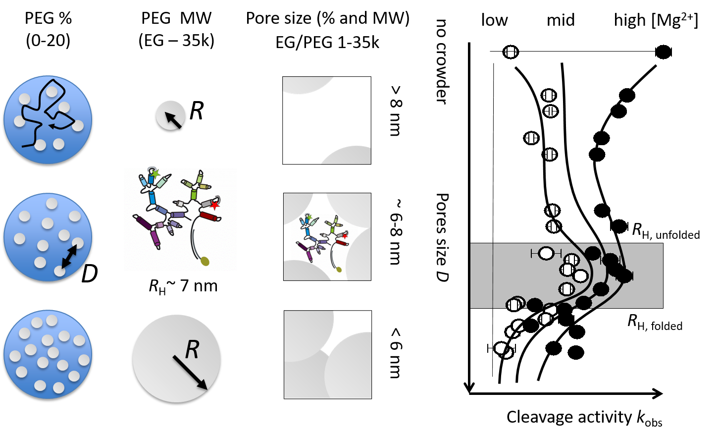 Ribozymes are catalytic active RNAs requiring a high magnesium(II) concentration to show folding and function in vitro [1,2]. In contrast, in vivo conditions are characterized by a highly crowded cellular environment and much lower ion concentration. Molecular crowding agents are used to mimic the cellular environment. However, particular physical/chemical properties explaining the co-solutes or the macromolecular crowders influence on folding and function of RNAs are poorly understood. In this study, we gain new insights on how polymer properties like dielectric constant, viscosity, diffusion and pore size influence the activity and folding of a large non-coding RNA, the group IIB intron ribozyme of S. cerevisiae [3,4]. We combined bulk activity assays, smFRET and NMR diffusion experiments screening the influence of volume fraction (%) and molecular weight (MW) of different crowding particles. We unveiled an optimal pore size of the crowder, i.e. the average distance of the crowding particles in solution, that matches the size of the ribozyme to maintain its catalytic activity even at lower magnesium(II) concentration.
