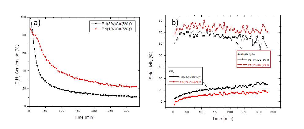 Heterogenization of a chloride-free Wacker catalyst system on a support holds a great potential to overcome these problems. Cu-and-Pd-exchanged zeolite Y catalyst proves to be one of the most active and stable catalysts for heterogeneous Wacker oxidation reported in the literature but ultimately suffers from rapid loss of its high initial activity [2]. Evidence of catalyst particle sintering and deposition of carbonaceous products is shown after the reaction by ex situ TEM. To optimize the catalyst, the effects of varying metal loading; pretreatment and reaction conditions; and kind of support on the performance of the catalyst were investigated. Lower Pd loading and a higher Cu/Pd ratio resulted in a more active and selective catalyst for Wacker oxidation (Figure 1). Regeneration of the catalyst at different conditions was also explored in order to recover the initial activity completely or partially. Moreover, in situ XAS studies revealed the presence of Pd(II) and Cu(II) species in the fresh catalyst; and the formation of Pd(0) through the course of the Wacker process.