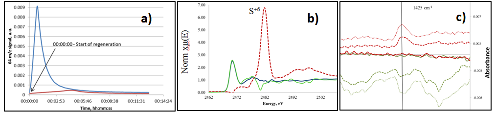 Figure 1: a) SO2 detected at the reactor outlet for Ru/Al2O3 (red) and Ru/SiO2 (blue) b) Sulfur K-edge XAS spectrum of Ru/SiO2 catalyst taken during methanation with poisoning (blue), regeneration in 1% O2 (red) and subsequent methanation (green); c) DRIFTS spectrum of Ru/SiO2 showing sulfate (ca. 1425 cm-1 band)4 formation (1% O2 regeneration after catalyst poisoning, red) and decomposition (1% H2, green) onSiO2 surface