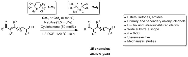 Building on previous studies in our group,[4] we report herein the application of two Pd catalysts to the deconjugation, isomerization and refunctionalization of α,β-unsaturated carbonyls in good to high yields.[5] Our system isomerizes di-, tri- and tetra-substituted olefins to highly valuable aldehydes and ketones regardless the chain length (>35 examples). Preliminary mechanistic will also be presented.