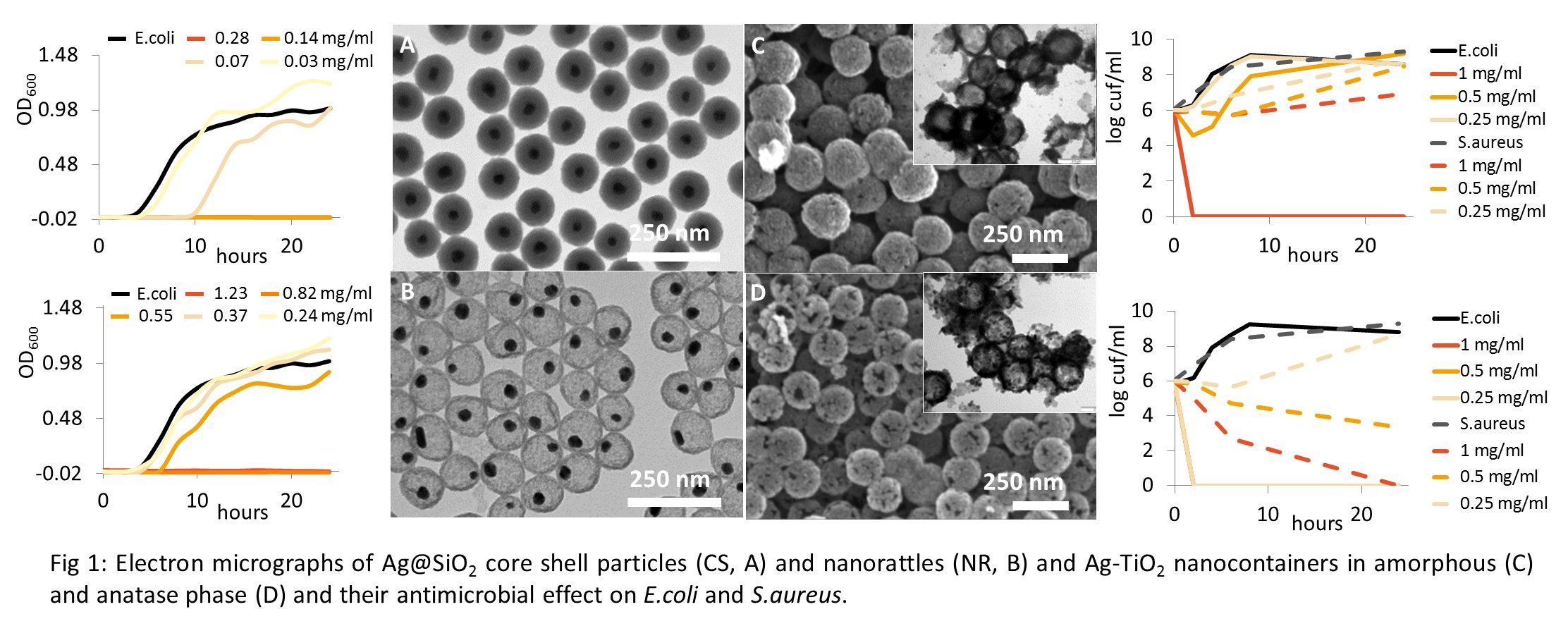 100 nm Ag@SiO2 core shell particles (CS, Fig. 1 A) have been realized by coating Ag nanoparticles synthesized by the polyol process with a silica shell by a modified Stöber method. In a second step the inner part of the silica shell was removed by a surface protected etching process1 which changes the particles’ morphology towards a so called nanorattle (NR, Fig. 1 B). In a second synthesis, Ag nanoparticle containing amorphous TiO2 nanocontainers of about 200 nm were synthesized by removing a polystyrene template (Fig. 1 C). A subsequent calcination step transforms the amorphous shell into crystalline anatase (Fig. 1 D). Depending on the particles’ morphology different Ag+ release kinetics could be observed by measuring ICP-OES. In the case of silica as shell material the nanorattles show a stronger release than the core shell particles over a long time period, but within the first 24 hours the reverse trend can be observed (Fig. 1, left). This correlates to the core shells better antimicrobial activity. Tests against E.coli show that they are killing at concentrations of about 0.14 mg/ml whereas 0.82 mg/ml of nanorattles are needed to see the same effect. In the case of TiO2 nanocontainers the anatase particles are able to release more Ag+ which is clearly reflected in their better antimicrobial efficiency against both, E.coli and S.aureus (Fig.1, right). In both cases no Ag related cytotoxicity was found against fibroblasts and macrophage cells. Antimicrobial tests against a multi-resistant S.aureus strain are ongoing. Both types of silver-containing particles thus fulfil the requirements for the development of novel antibacterial nanocoatings on biomaterial surfaces. Currently we are developing strategies to link them to implant model surfaces of titanium or to incorporate them into polymer matrices.