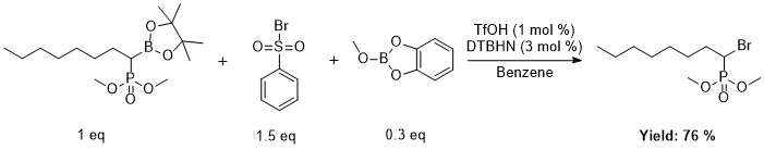 Organoboranes, commercially available or easily prepared via hydroboration of olefins, represent a very attractive source of alkyl radicals [1]. The B-alkylpinacolboranes are easy to handle since they are moisture- and air-stable. For instance, they can be readily purified by flash chromatography [2]. The generation of radicals from B-alkylpinacolboranes requires formation of ate complex followed by treatment with a strong oxidant [3]. We report here that B-alkylpinacolboranes can be used as radical precursors in the absence of oxidizing agent, using in situ transesterification process. Highly efficient chain reactions, leading to the products of allylation, bromination as well as hydrogen atom transfer, are reported. Substrate, obtained by hydroboration of unactivated or activated by both EWG or ERG, can be successfully modified by suggested method. Even α-chloro, α-iodo and α-phosphonato radicals provided high yields.