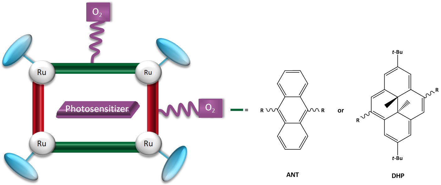 The project consists of preparing metalla-assemblies to transport both the photosensitzer and 1O2 to cells. DHP or ANT units can be attached to the assembly as connectors between the dinuclear arene ruthenium clips or inserted as appendages on the different building blocks. The cavity of the metalla-assembly can also be used to transport a photosensitizer.[4]
