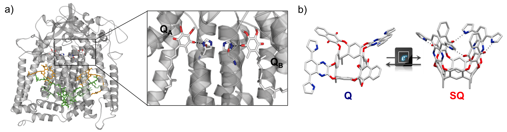 Figure 1. Schematic representation of the (a) photosynthetic reaction center of Rb. sphaeroides (PDB 1DV3) that inspired the design of (b) electro-photoswitchable molecular grippers.