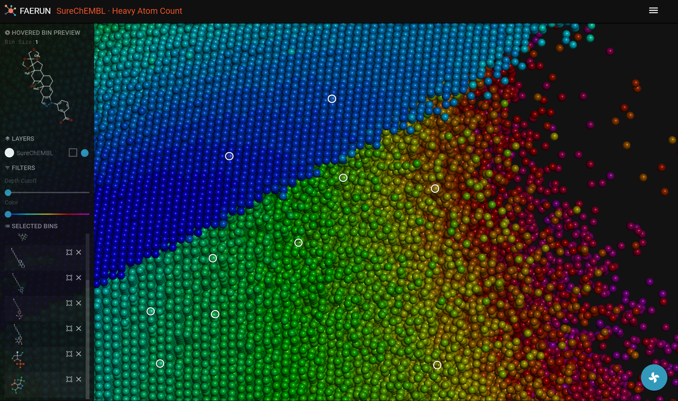 Building on the Java-based mapplets our group has published in the past2, we work on furthering the concept of interactively exploring chemical data in spatial representations as a complement to searching the data, which is often the only way to access databases such as ChEMBL, SureChEMBL or even relatively small data sets such as Drugbank. Given recent developments in web technology and broadband infrastructure, we focus our work on web-based applications3,4.