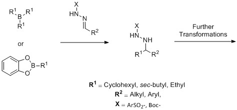 Trialkylboranes and alkyl-catecholboranes (commercially available or prepared by hydroboration of olefins) represent a versatile source of alkyl radicals which can be used in different synthetic transformations.1 The nucleophilic character of the radicals generated makes possible their addition to suitable electrophilic traps.2 In this work we describe the addition of alkyl radicals to hydrazones which by turn can serve as a method for the functionalization of olefins. Additionally, we present insights about how the corresponding products can be further transformed into compounds of synthetic value.