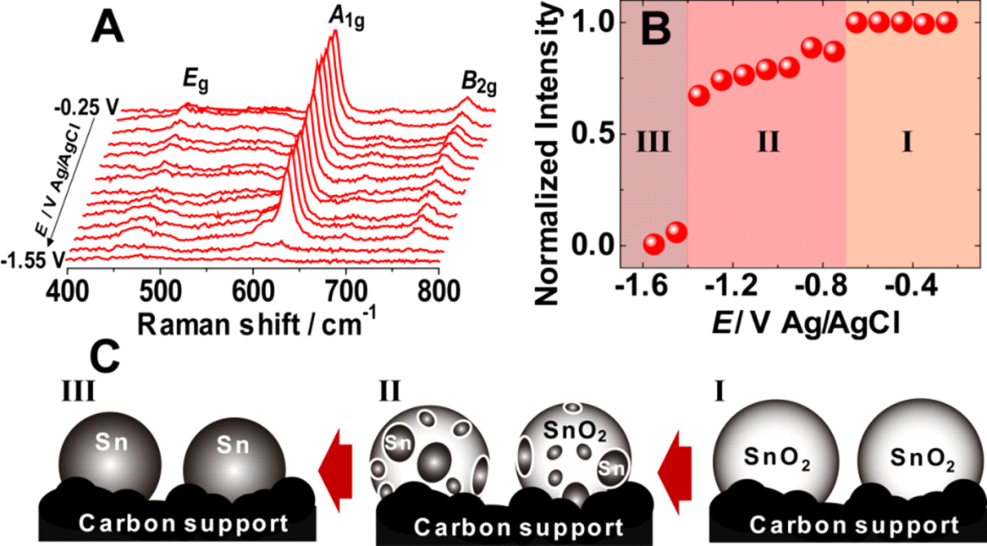 Fig.1 In operando Raman studies at varied potential (A) The relative intensities of the SnIV-related A1g Raman peaks (B). In the three distinct potential regions represented by the shaded background, the catalyst is in the form of fully oxidized SnO2 (I), a partially reduced compound of mixed oxidation state (II) and completely reduced metallic Sn (III), as illustrated by the scheme of (C).