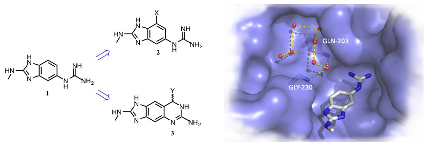 To exploit the newly opened chemical space for drug development, a series of ligands with vectors targeting this sub-pocket have been prepared (ligand series 2 and 3). This work presents the synthesis and initial results on the development of a new class of TGT inhibitors occupying the newly observed subpocket.