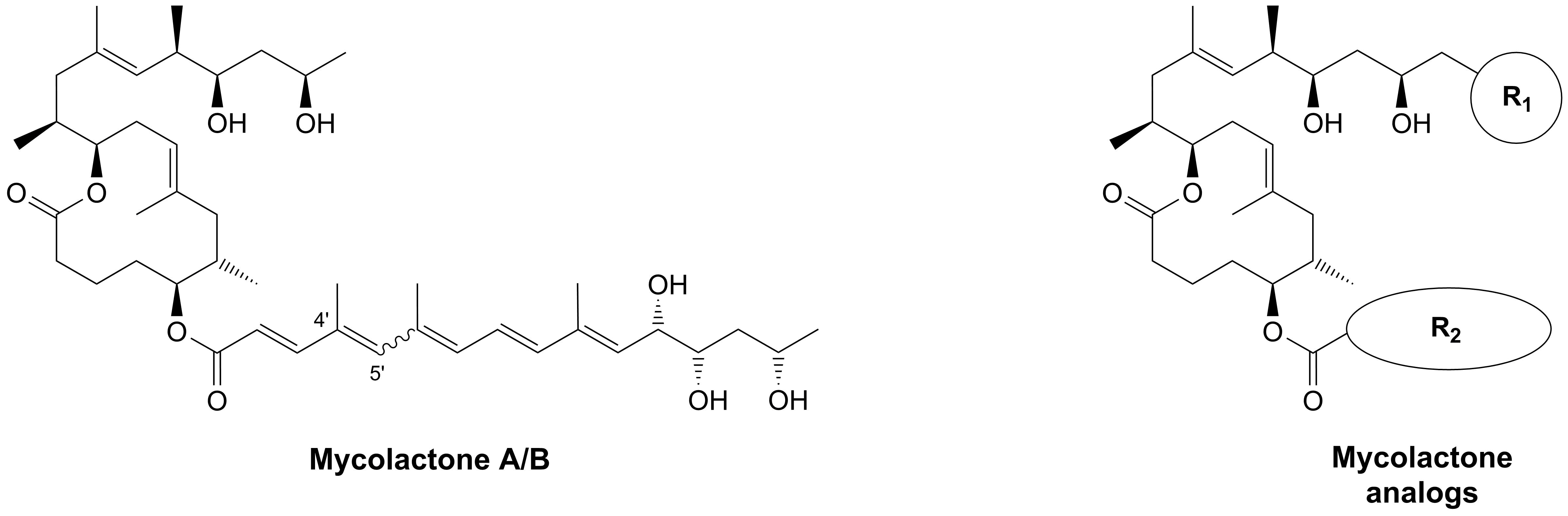 Mycolactones are a group of macrolides which exhibit cytotoxic, immunosuppressive and analgesic properties. As the exotoxins of the human pathogen Mycobacterium ulcerans, mycolactones are central to the pathogenesis of the neglected disease Buruli ulcer, a severe and chronic medical condition characterized by necrotic skin ulcers. Despite extensive research in several academic laboratories, the molecular mechanism of action of mycolactones is still heavily debated and it is not even clear whether the cis-∆4’,5’ or the respective trans-derivative is the major contributor to bioactivity.