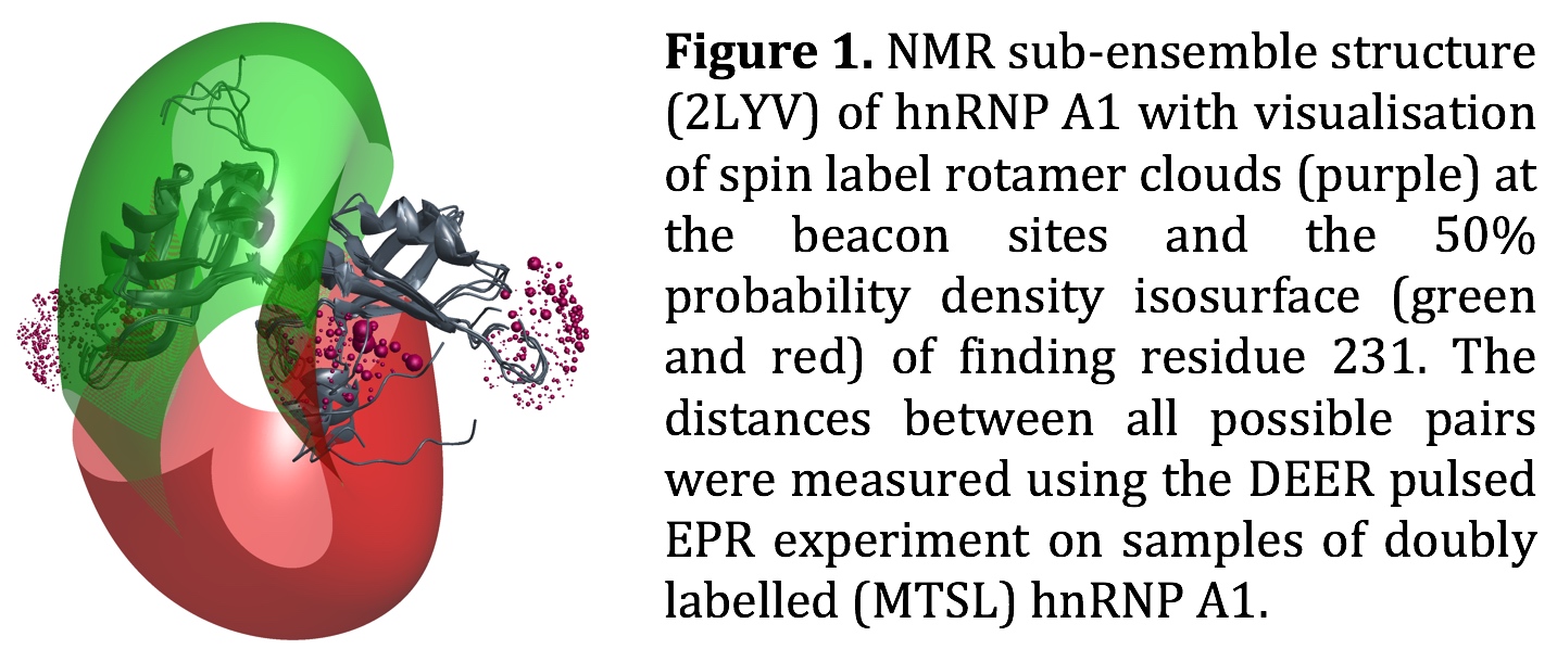 The regulatory function of the human protein hnRNP A1 in splicing is believed to be mediated by multimerisation of individual hnRNP A1 units on long RNAs via an intrinsically disordered C-terminal domain [1]. The two N-terminal domains of hnRNP A1 are known to fold in a well-defined structure, which has been solved by X-ray crystallography, and more recently by solution NMR (pdb: 2LYV). The high degree of flexibility of the C-terminal domain, however, makes it inaccessible for both structural techniques. Using site-directed spin labelling, we determine distance distributions from residues in the structured domains, termed beacon sites, to individual residues in the disordered domain using the DEER pulsed EPR technique [2]. Together with a set of distances measured between the beacon sites themselves, it is then possible to calculate a spa-tial distribution of the position of a given residue in the disordered domain, which can be visualised as an isosurface of the probability density [3]. This analysis approach is included in the current version of the modelling software MMM [4].