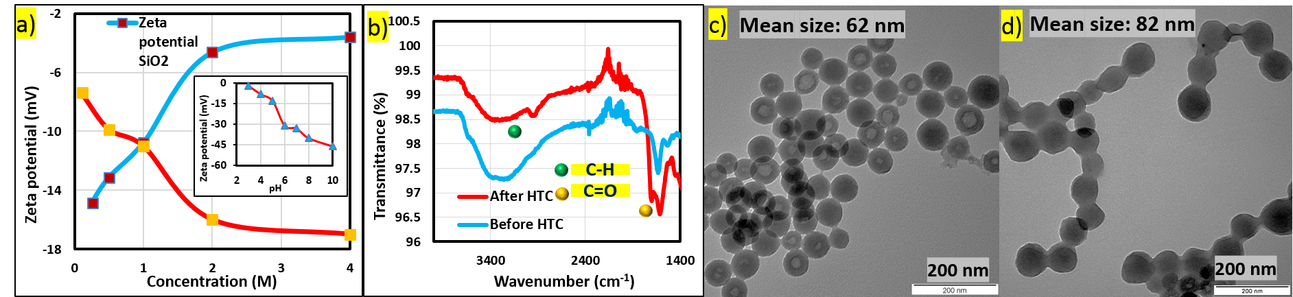 Figure 1: Graphs showing Zeta potential analysis (a) and FTIR (b), TEM images showing SiO2 NPs before (c) and after (d) hydrothermal carbonization Figure 1a shows the zeta potential measurements as a function of the concentration of silica and sucrose, which was used as carbon source. The inset graph shows that the silica suspension is more stable at high pH. The FTIR graph in figure 1b shows the presence of C=O and C-H bands after coating of sucrose on the surface of silica. The TEM images 1c and 1d show the as-formed silica NPs before and after hydrothermal carbonization, respectively. The particle size increased after the hydrothermal process, probably due to formation of a porous, spongy carbon shell.