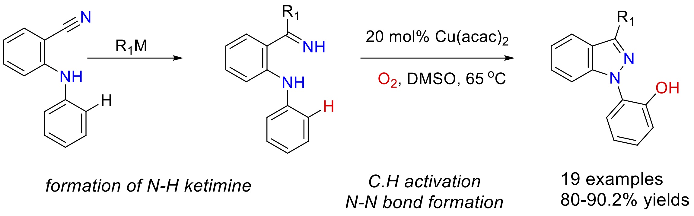 A facile, one-pot synthesis of 1H-indazoles featuring a Cu-catalyzed C-H ortho hydroxylation and N-N bond formation using pure oxygen as terminal oxidant is described. Reaction of readily available 2-arylaminobenzonitriles with various organometallic reagents led to ortho-arylamino N-H ketimine species. Subsequent Cu-catalyzed hydroxylation at ortho-position of the aromatic ring followed by N-N bond formation in DMSO under pure oxygen afforded a wide variety of 1-(ortho-hydroxylaryl) 1H-indazoles in good to excellent yields. The efficient methodology does not require utilization of noble metal catalysts, elaborated directing groups and privileged ligands.