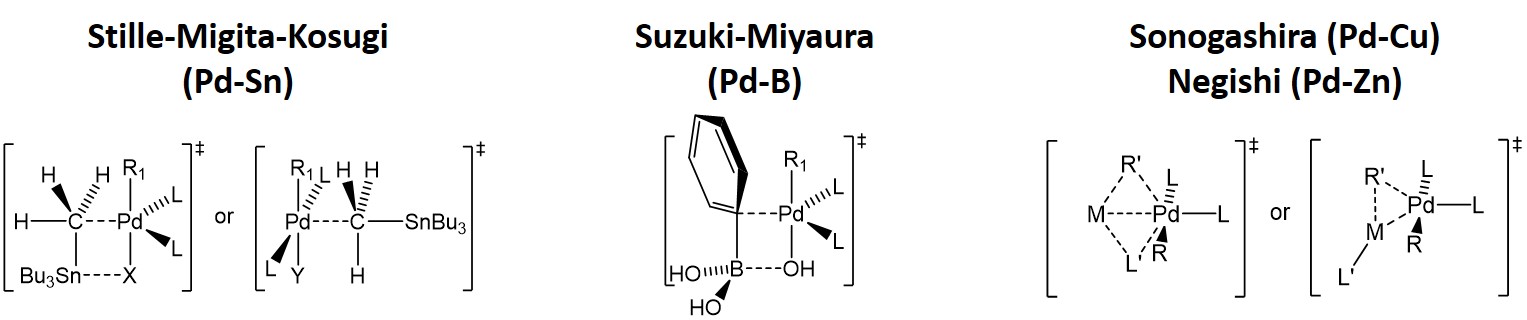Pd-catalyzed cross-coupling reactions have become one of the key processes for carbon-carbon bond formations. Even though their organometallic coupling partners vary, it is understood that they all follow a common general catalytic cycle in which a transmetalation reaction is one of the key steps. The mechanism of transmetalation reactions has been most thoroughly studied for the Stille reaction and for the Suzuki-Miyaura coupling, and it has been proposed that the reaction proceeds via either an open (SN2 like) or closed transition state. Gas phase and computational studies on the mechanisms of the Sonogashira (Pd/Cu) and Negishi (Pd/Zn) transmetalations suggest that these reactions proceed somewhat different. [1] The main difference is the existence of direct metal-metal (d8-d10) interactions in calculated structures of transition states and intermediates.