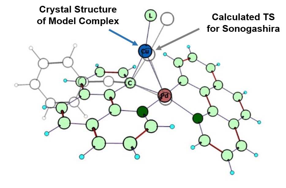 To study the crucial Pd(II)-Cu(I) [2] and Pd(II)-Zn(II) [3] interactions experimentally we have prepared isolable heterobimetallic d8-d10 complexes. The crystal structures resemble computed transition states for the Sonogashira and Negishi transmetalation steps and we have investigated the bonding qualitatively and quantitatively by X-ray, NMR, mass spectrometry (ESI-MS/MS) and calculations (DFT).