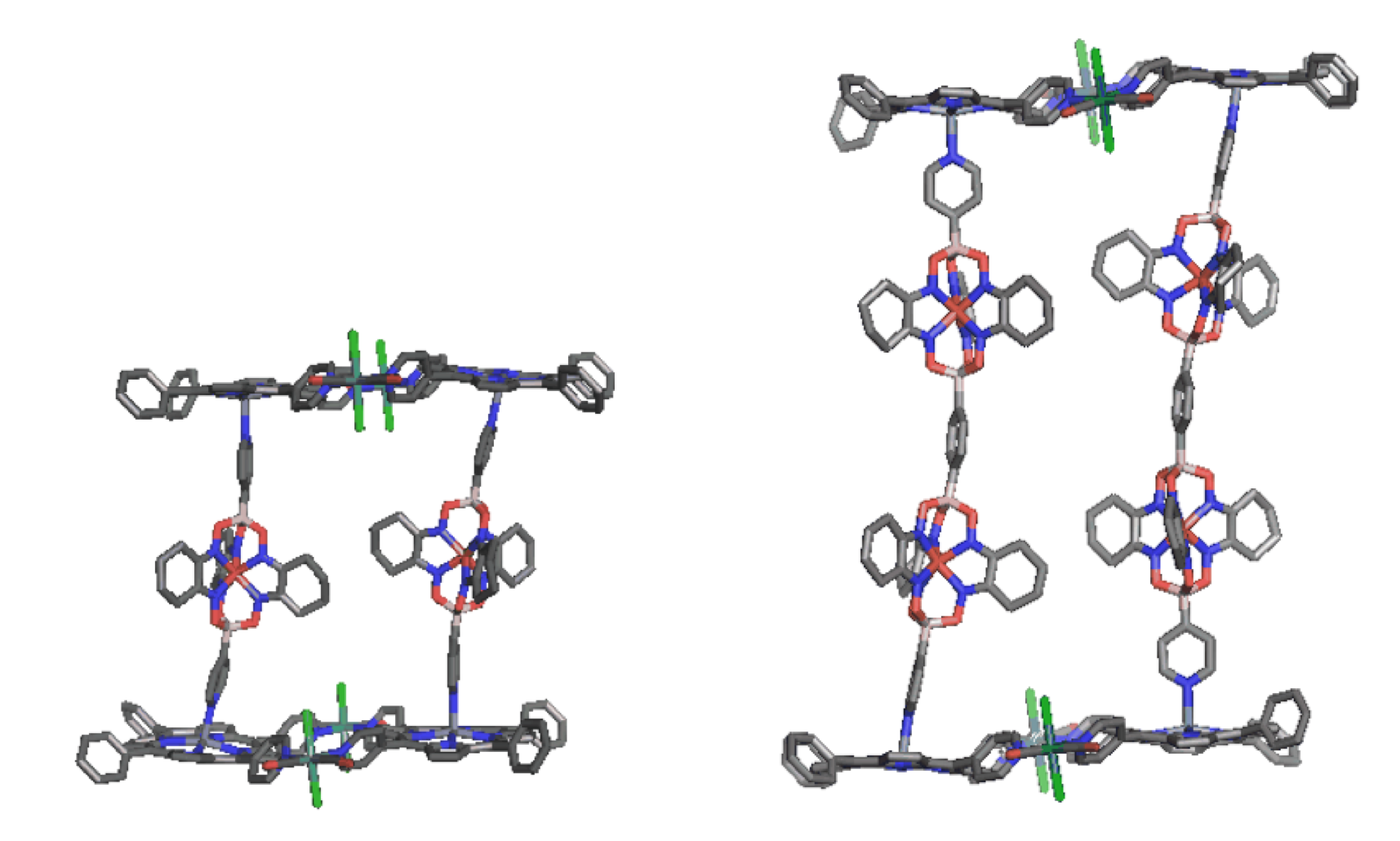 Heterotrimetallic assemblies based on Zn(II)-porphyrin metallacycles and dipyridyl-capped Fe(II)-clathrochelate complexes.