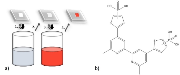 Heteroleptic [Cu(6,6'-dimethyl-2,2'-bipyridine)A(6,6'-dimethyl-2,2'-bipyridine)C]+ (A: anchoring ligand, C: capping ligand) complexes in which the bpy units are functionalized in the 4- and 4'-positions are known to be good light harvesting materials in dye-sensitized solar cells (DSSCs). When the formation of isolated heteroleptic [Cu(bpy)A(bpy)C]+ complexes is attempted, equilibration occurs giving mixures of homo- and heteroleptic complexes; separation is very difficult. Therefore our group has developed a stepwise build-up of DSSCs (Figure 1a): a 'surface-as-ligand, surface-as-complex' approach. For the first step a 6,6'-dimethyl-2,2'-bipyridine ligand, which is modified in the 4 and 4'-positions by a spacer bearing an anchoring group (e.g. 4-phenylphosphonic acid, Figure 1b) is bound to a TiO2 surface. Afterwards Cu(I) and a capping ligand are introduced by a ligand exchange reaction between the anchored bpyA and a bpyC of the homoleptic [Cu(bpyC)2]+ complex. In previous work done by our group, much focus was put on the modification of the capping ligand to enhance photo to current efficiencies. The standard anchoring ligand with the best performance, which is currently used in our group is shown below. Changing the anchoring group from phosphonic acid to alternative groups1, as well as modifying the phenyl spacer to a thiophene spacer has been investigated2 with a goal of enhancing solar cell performance for [Cu(bpy)2]+ complexes. Targets are to gain better affinity of the anchoring group to TiO2, better electron transport through the spacer, less electron recombination between dye and electrolyte and an overall longer electron lifetime within the complex.