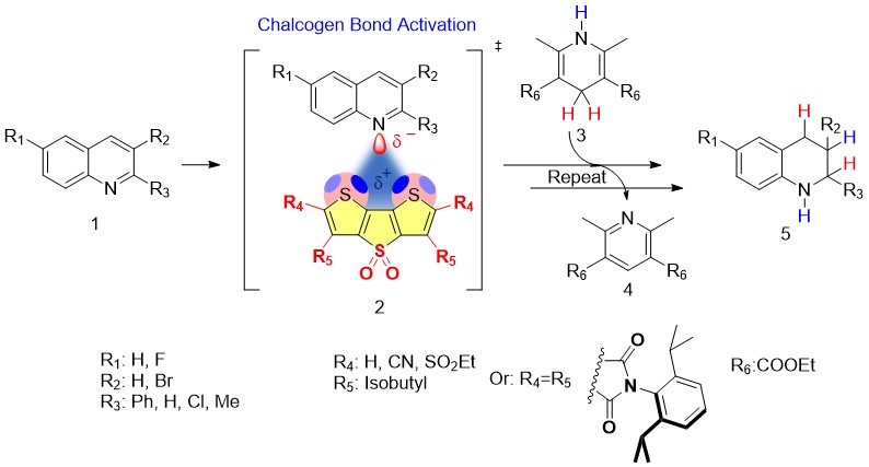 Through interaction with the nitrogen lone pair DTTs are a privileged motive to activate imines and quinolines for Hantzsch ester mediated transfer hydrogenation. Over a 1000-fold rate enhancement, stronger activities with deeper σ holes and wider bite angles, chloride inhibition and correlation with computed binding strengths yield strong evidence for operational chalcogen bonds. Lessons learned are being currently applied to asymmetric catalysis with selenium based chalcogen binders.