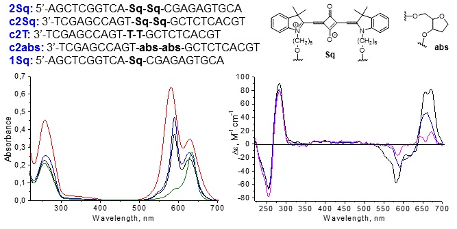 In this work, oligonucleotides 2Sq and c2Sq with two squaraine molecules sequentially incorporated in the backbone were synthesized by phosphoramidite approach and their absorption, fluorescence, circular dichroism (CD) spectra and quantum yields (Q.Y.) were studied before and after hybridization. The same spectral properties were investigated for duplexes 2Sq*c2T and 2Sq*c2abs where deoxythymidine (T) or abasic site (abs), correspondingly, were placed opposite squaraine (Sq) molecules. Melting temperatures (Tm) of the duplexes were also studied.